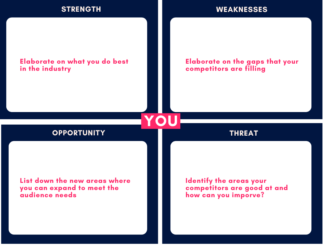SWOT stands for Your Strengths, Weaknesses, Opportunities in the market and the Threats in the industry (your competitors). This framework was invented in the 1960s by Albert Humphrey and is still used by every new and established business because it creates the foundational basis of the business model.